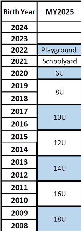 How does it really work? Registration for MY2025 for a player that is presently 11 and turns 12 at any time in 2025 will be in the 12U division. If a player is presently 12, but turns 13 during the Fall of 2025 or in 2026, s/he will be in 14U.